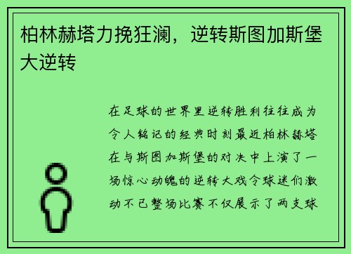 在足球的世界里,逆转胜利往往成为令人铭记的经典时刻。最近,柏林赫塔在与斯图加斯堡的对决中上演了一场惊心动魄的逆转大戏,令球迷们激动不已。整场比赛不仅展示了两支球队的激烈对抗,也让我们见识到了柏林赫塔在逆境中奋起的拼搏精神。